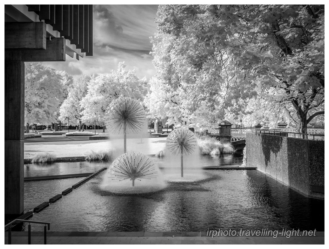 The Ferrier Fountain or Dandelion Fountain of the Town Hall, looking across the Avon to Victoria Square, in Christchurch, New Zealand.