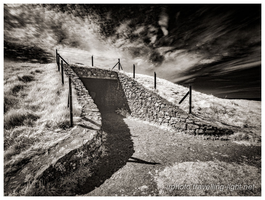 The reconstructed entrance to Barclodiad y Gawres, a chambered tomb above Porth Trecastell, Anglesey.